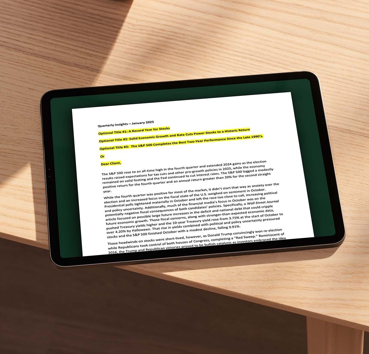 Designed specifically for financial advisors, our Quarterly Letter simplifies complex information, making it easy for you to communicate with clients. Use our content to keep them engaged and informed during turbulent times, reinforcing your role as their trusted advisor.